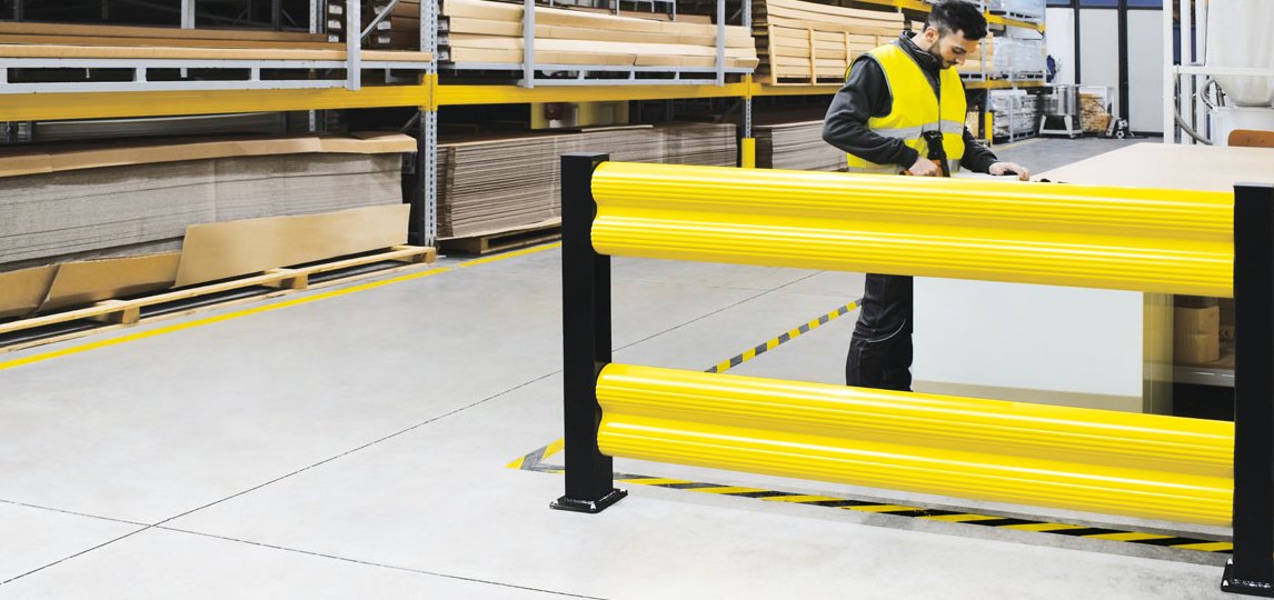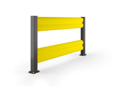 New pedestrian safety barrier suitable for areas where heavy loads are handled. The barrier has a double profile which is highly flexible and more resistant to shocks. 2000 mm modules with continuous fixing according to customer requirements. The inner junction between the Bflex profile and the vertical column ensures a space-save solution. Fixing accessories and shock absorber pad included.