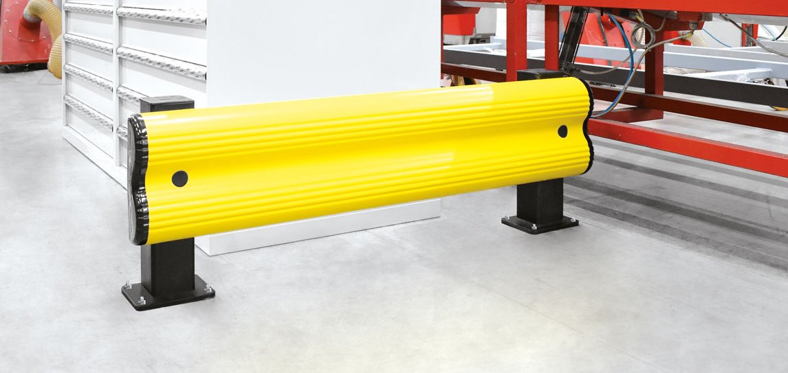 Safety barrier for racks with single and double headboard, highly flexible and shock absorber. Its double-arched design guarantees a wide base of impact for vehicles and heavy loads. The front fixing of Bflex profile on the vertical column ensures the maximum protection both over the entire lenght of the guardrail and on its external corners. Ideal for handling areas with heavy traffic. Standard 1100 mm and 2400 mm modules are available also with continuous fixing. Fixing accessories and shock absorber pad included.